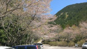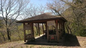登山口にはこのような東屋があります。帰りには桜の散る中、ギターを弾いていた方もいました。カッコいい!