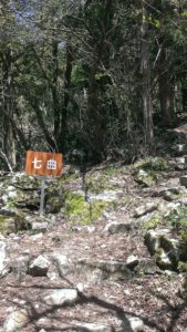 七曲り。この看板の前あたりから斜度がかなりきつくなっており、結構キツい。