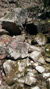 道幅はそれほど広くないですが、岩に赤矢印が。